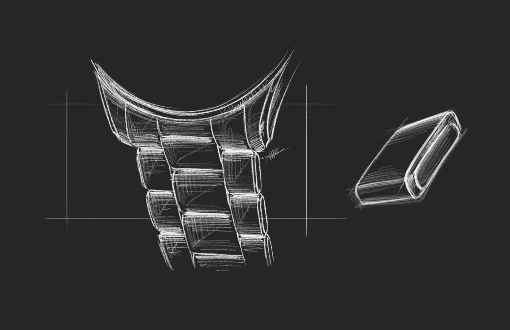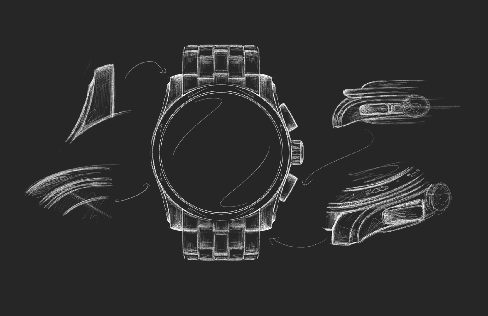 Because of the movement, we knew this inevitably was going to be more premium-priced than the existing pieces in our collection. The whole watch had to feel worthy of this. Fortunately, we’d made great progress while working on the Jump Hour, etching out a highly decorated case and bracelet architecture that the Chronograph would come to inherit. Featuring polished concave cut-outs on the upper portion of the midcase instead of a chamfer, the otherwise paired-back case truly shines upon close inspection. This same design detail can be found on the lower portion of the bezel. When the two pieces meet, a perfect semi-circle comes to life. The bracelet is also our most premium yet, with polished chamfers wrapping around the edges of each individual link’s flanks.