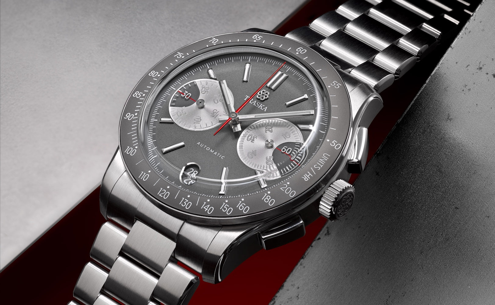Finally, we come to the tachymeter markings. Most chronographs with a tachymeter scale measure units per hour in a range from 400 to 60. 400 units per hour is fast. Really fast. Who even needs to measure something that fast? Our watches are designed to actually be used, so we decided to slow things down, compressing the tachymeter scale range to 200-50 units per hour. We feel like this scale will have more real-world applications for those of us not in the habit of high-speed racing. What are those real-world applications, you ask? Well, you’ll just have to tell us.